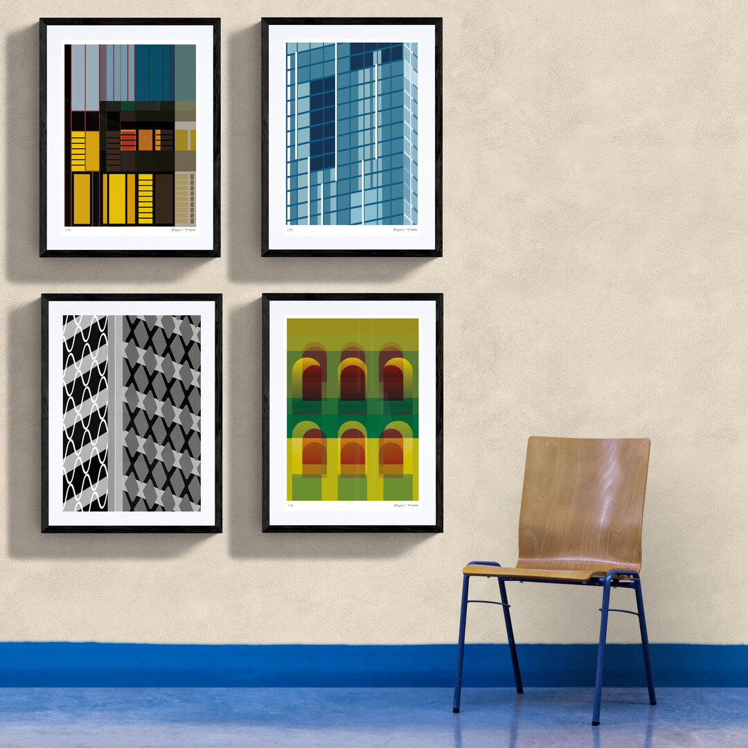 A limited edition collection of four large geometric abstractions drawn from architectural forms. Edition consists of 10 prints of each image individually signed and numbered.