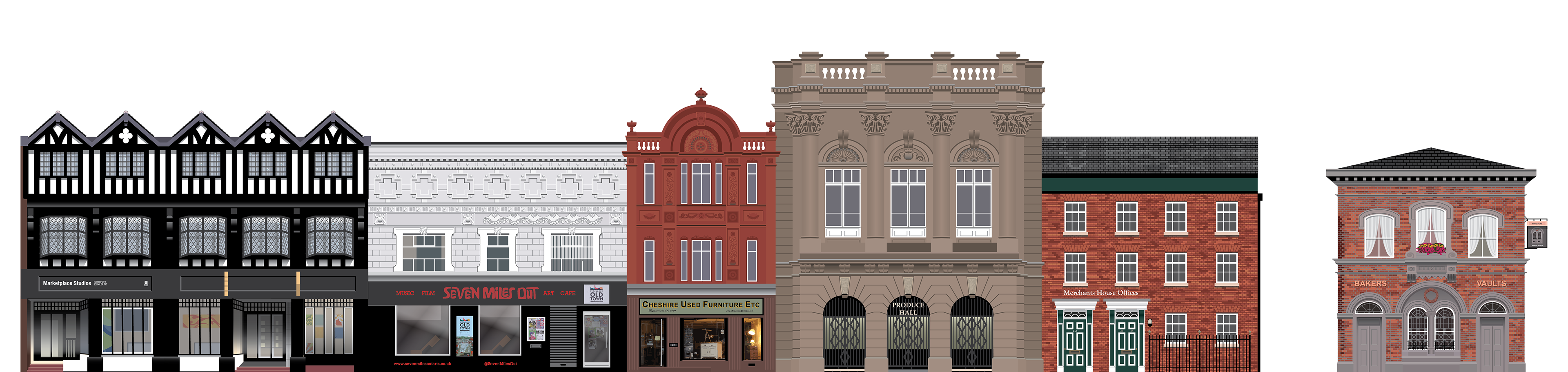 Digital illustration of Stockport Market Place buildings